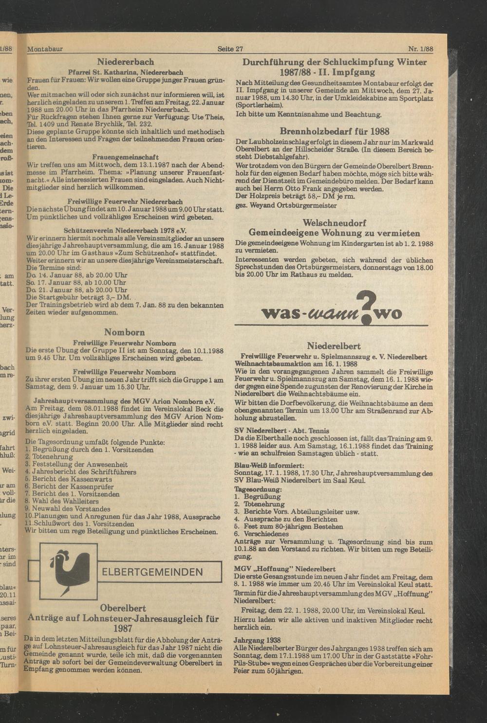 Wer mitmachen will oder sich zunächst nur informieren will, ist herzlich eingeladen zu unserem 1. 'Reffen am Freitag, 22. J anuar 1988 um 20.00 Uhr in das Pfarrheim Niedererbach.