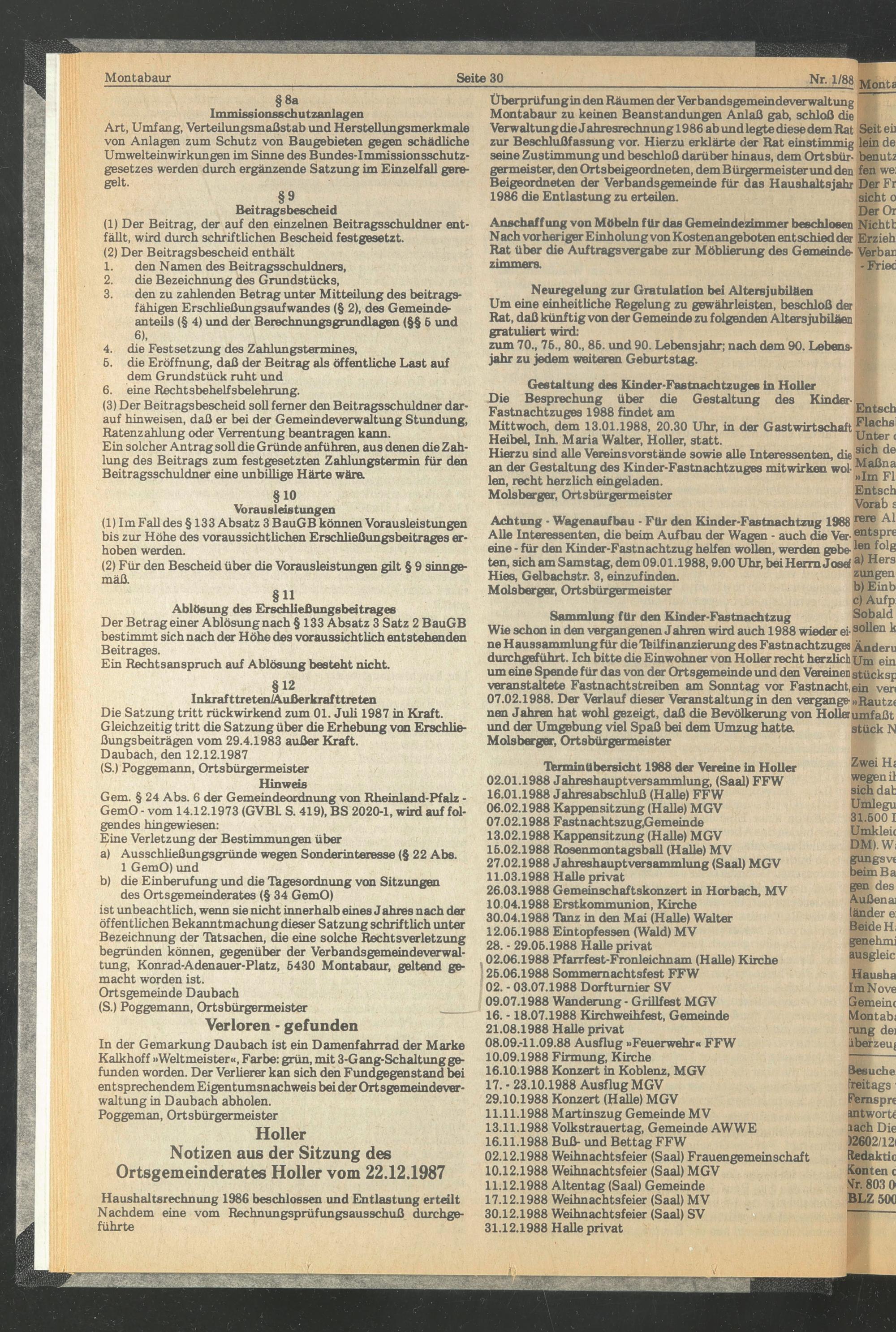 Notizen aus der Sitzung des Ortsgemeinderates Holler vom 22.12.1987