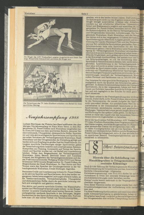 Bevor die Sportvereine TUS Montabaur, ASV Niederelbert| TV J ahn, Eitelborn Kostproben ihres Programms und Traii den G ästen zeigten, wünschte Bürgermeister Dr. Possel-Di allen anwesenden Gästen ein erfolgreiches Jahr 1988 In vielen Einzelgesprächen mit aktiven Sportlern, Verein! ständen und ehrenamtlichen Helfern nutzte Bürgermeisi Possel-Dölken die Gelegenheit, sich z.B. über aktuelle Probl im sportlichen Bereich, Hainingsmöglichkeiten und einsarbeit zu informieren.