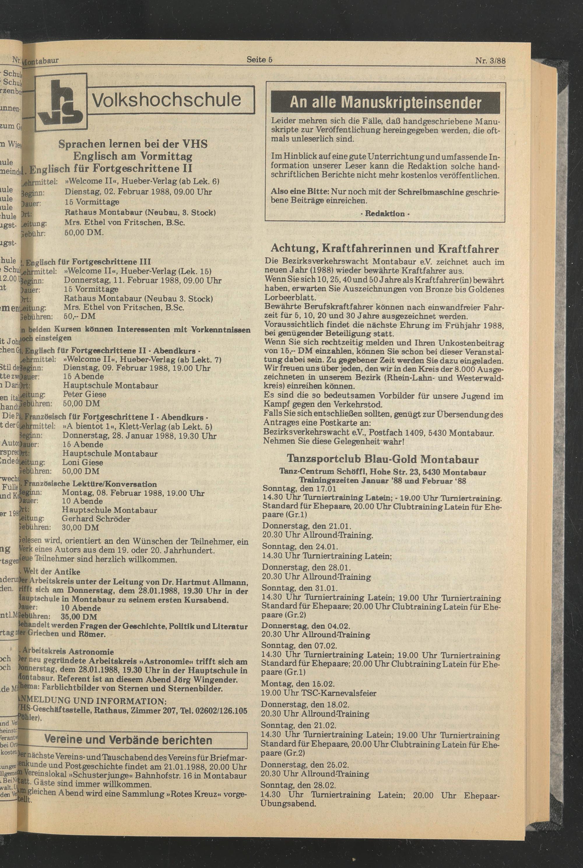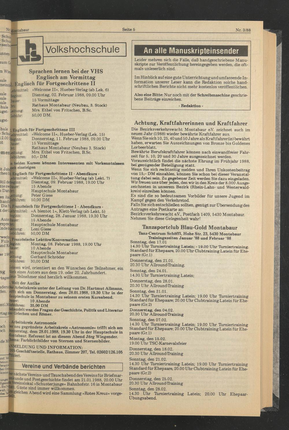 •erArbeitskreis unter der Leitung von Dr. Hartmut Allmann, rifft sich am Donnerstag, dem 28.01.1988, 19.30 Uhr in der laqptschule in Montabaur zu seinem ersten Kursabend.