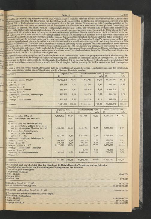 )er eigentlichen Abstimmungüber den H aushaltsplanent wurf 1988 sowie das Investitionsprogramm wurde die Abstimmungüber je bereits vorerwähnten Änderungsanträge zur Reduzierung des Volumens im Vermögenshaushalt vorangestellt. Zu beiden Abstimmungen stellte der Vorsitzende die Einstimmigkeit im Rat fest. Bürgermeister Dr. Possel-Dölken bemerkte anschließend, daß J£it seiner Amtsübernahme damit zum ersten Mal ein Haushaltsplan die Zust imm ung aller im Rat vertretenen Fraktionen gefunden habe.