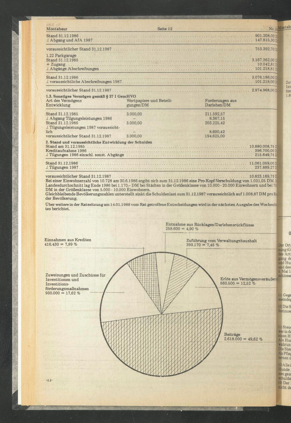 Gleichbleibende Bevölkerungszahlen unterstellt sinkt die Schuldenlast zum 31.12.1987 voraussichtlich auf 1.008,87 DM pro Kt| der Bevölkerung.