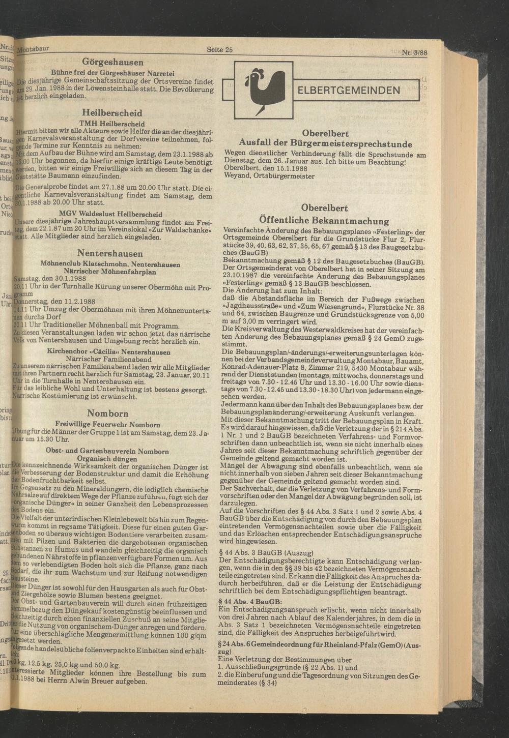 Wegen dienstlicher Verhinderung fällt die Sprechstunde am Dienstag, dem 26. Januar aus. Ich bitte um Beachtung! Oberelbert, den 15.1.1988 Weyand, Ortsbürgermeister