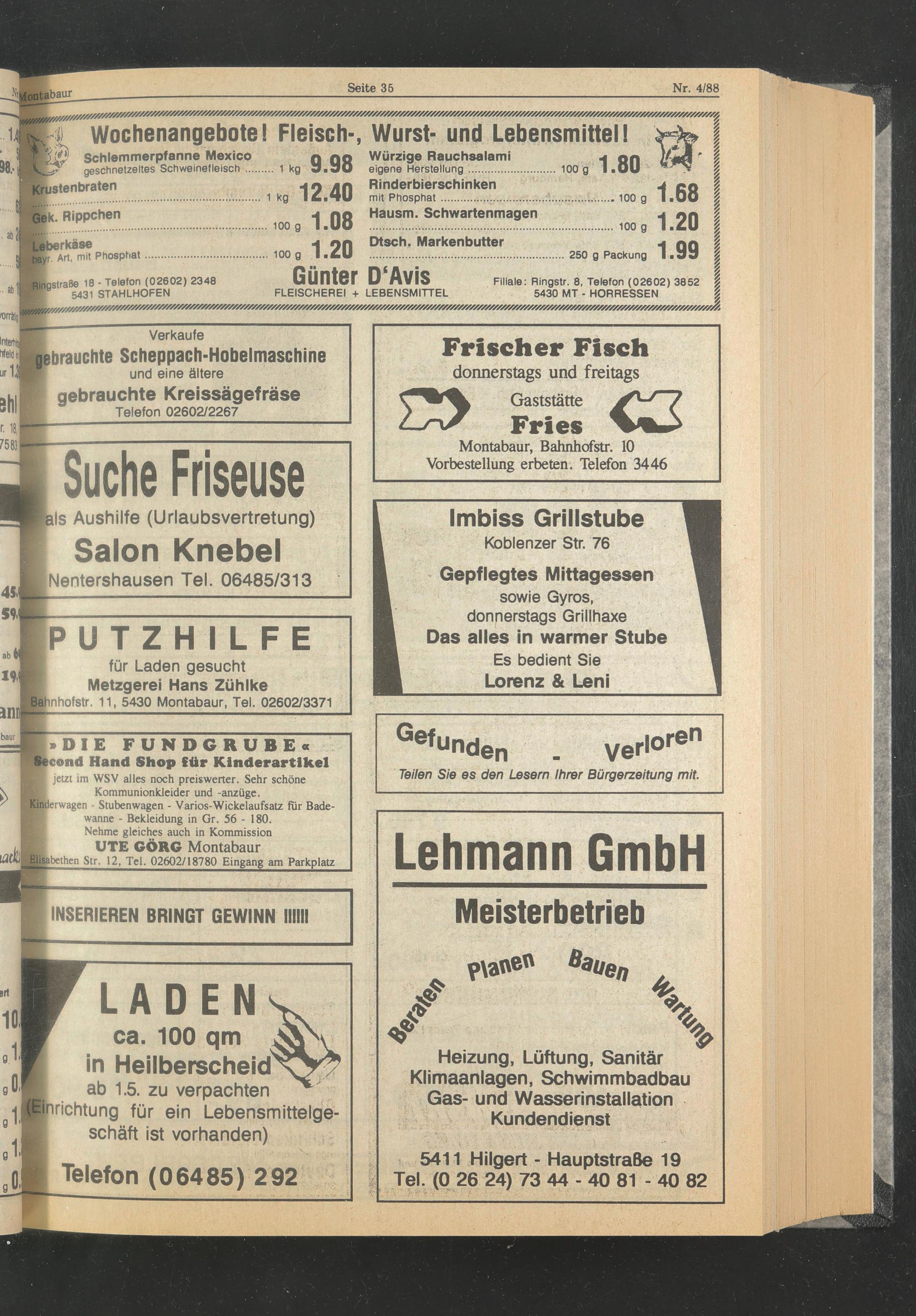 Montabaur, Bahnhofstr. 10 Vorbestellung erbeten. Telefon 3446
