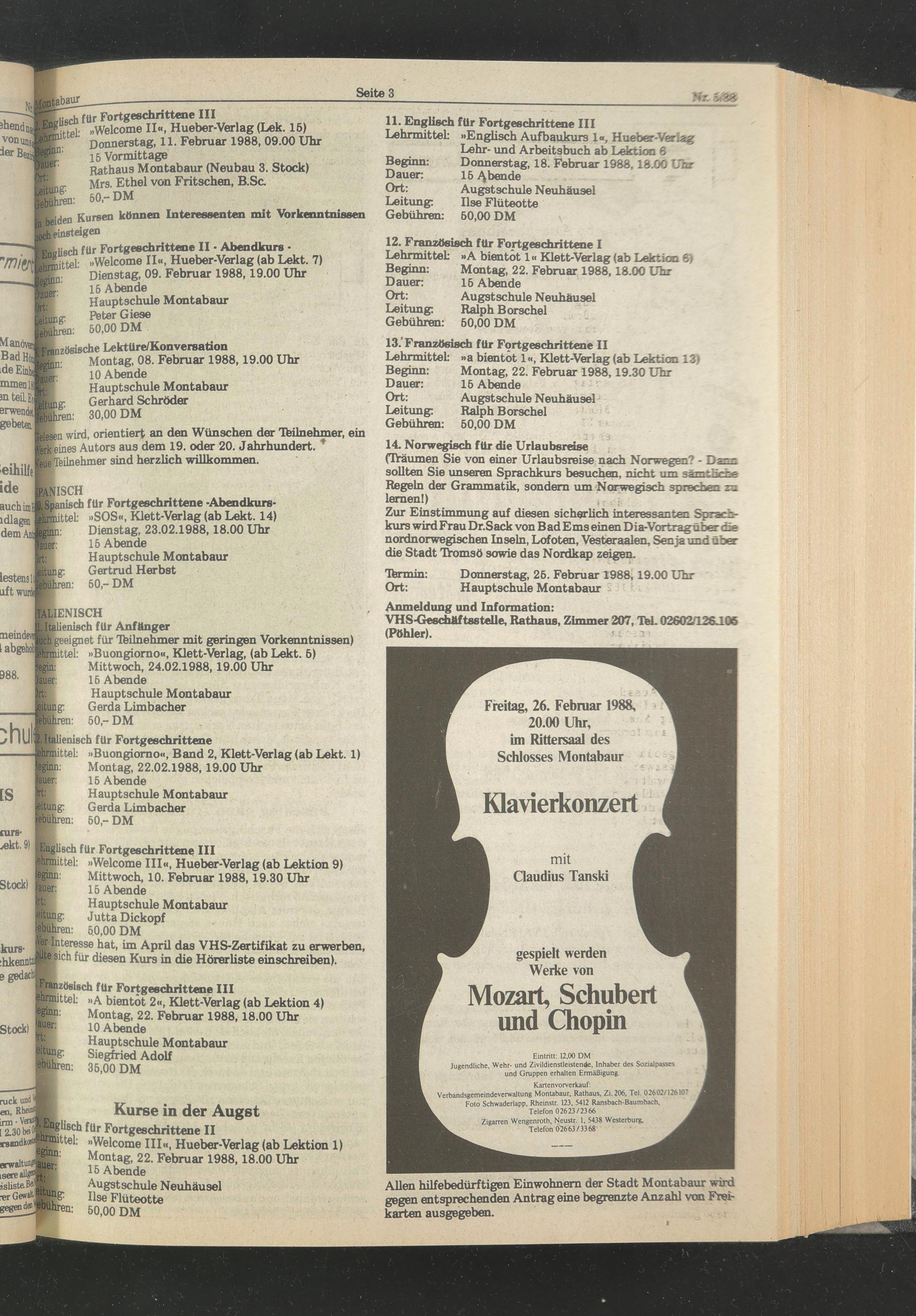 Kurse in der Augst [[lisch für Fortgeschrittene II ittel: »Welcome III«, Hueber-Verlag (ab Lektion 1) Montag, 22. Februar 1988,18.00 Uhr 15 Abende