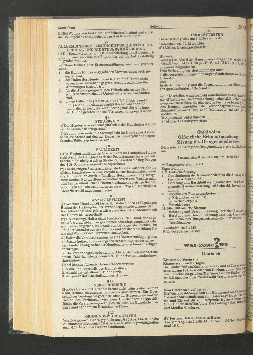Untershausen, 22. März 1988 (S.) Müller, Ortsbürgermeister