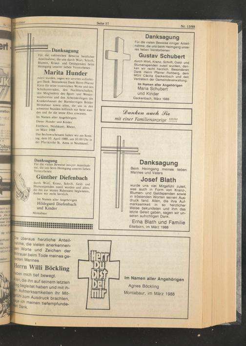 Das Sechswochenamt halten wir am Sonntag, dem 10. April 1988, um 10.00 Uhr in der Pfarrkirche St. Anna in Neuhäusel.