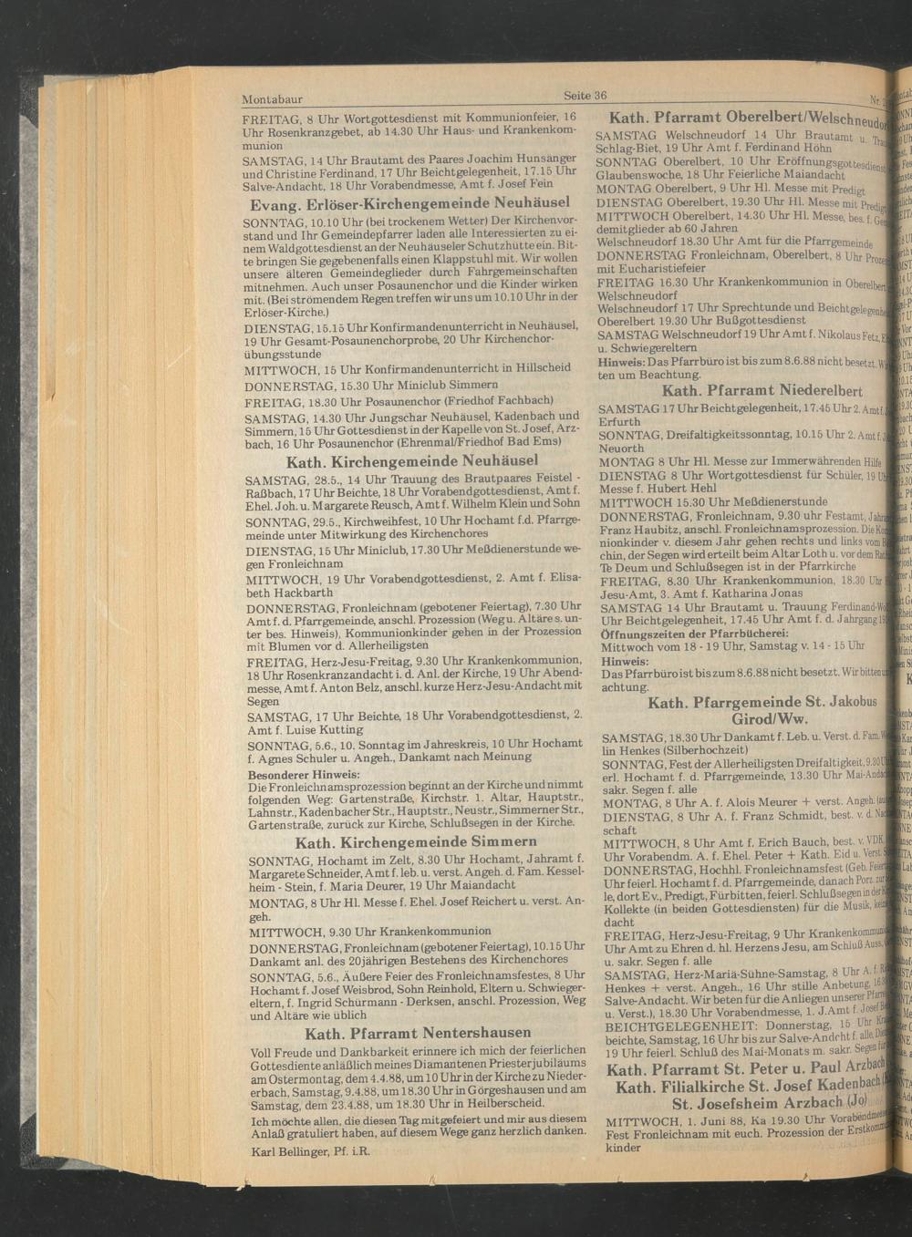 Voll Freude und Dankbarkeit erinnere ich mich der feierlichen Gottesdiente anläßlich meines Diamantenen Priesterjubiläums am Ostermontag, dem 4.4.88, um 10 Uhr in der Kirche zu Niedererbach, Samstag, 9.4.88, um 18.30 Uhr in Görgeshausen und am Samstag, dem 23.4.88, um 18.30 Uhr in Heilberscheid.