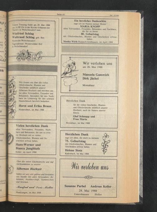 Unsere Trauung findet am 28. Mai 1988 um 14.00 Uhr in der Kirche »Johannes der Täufer« in Welschneudorf statt.