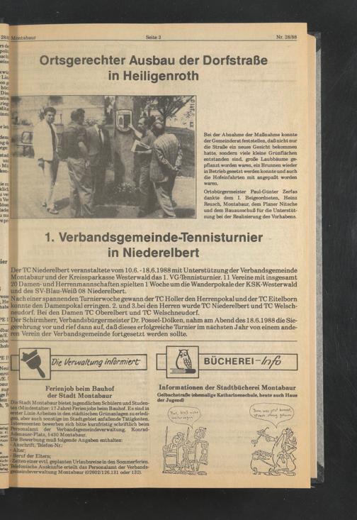 Der TC Niederelbert veranstaltete vom 10.6. -18.6.1988 mit Unterstützung der Verbandsgemeinde Montabaur und der Kreissparkasse Westerwald das 1. VG-Tfennistumier. 11 Vereine mit insgesamt 20 Damen- und Herrenmannschaften spielten 1 Woche um die Wanderpokale der KSK-Westerwald und des SV-Blau-Weiß 08 Niederelbert.