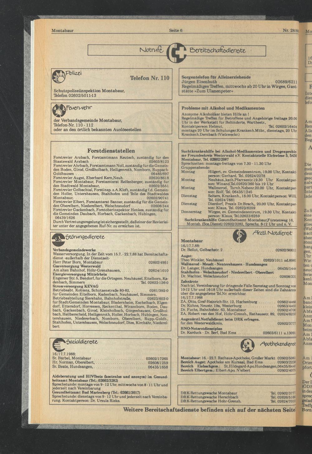 der Verbandsgemeinde Montabaur, Tfelefon-Nr. 110-112