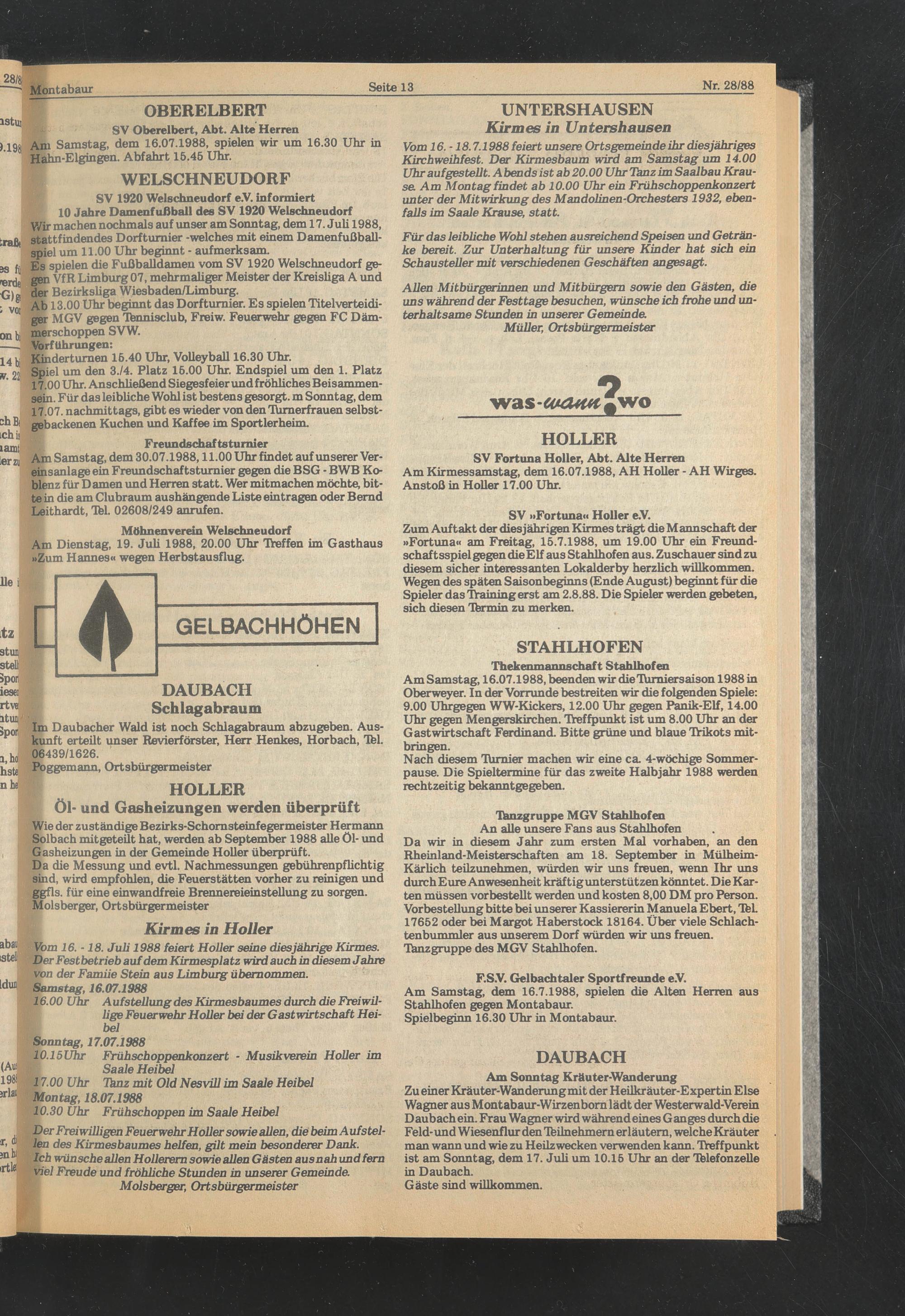 abaij- Vom 16. -18. Juli 1988 feiert Holler seine diesjährige Kirmes. stell Der Fest betrieb auf dem Kirmesplatz wird auch in diesem Jahre ijübn der Famiie Stein aus Limburg übernommen. tdui. ßamstag, 16.07.1988