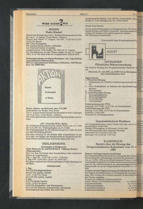 Anmeldung bis Freitag, 19.8.1988 bei: Nicole Zerfas, Bresl Straße 22, 6431 Heiligenroth, Tbl. 02602/16606.