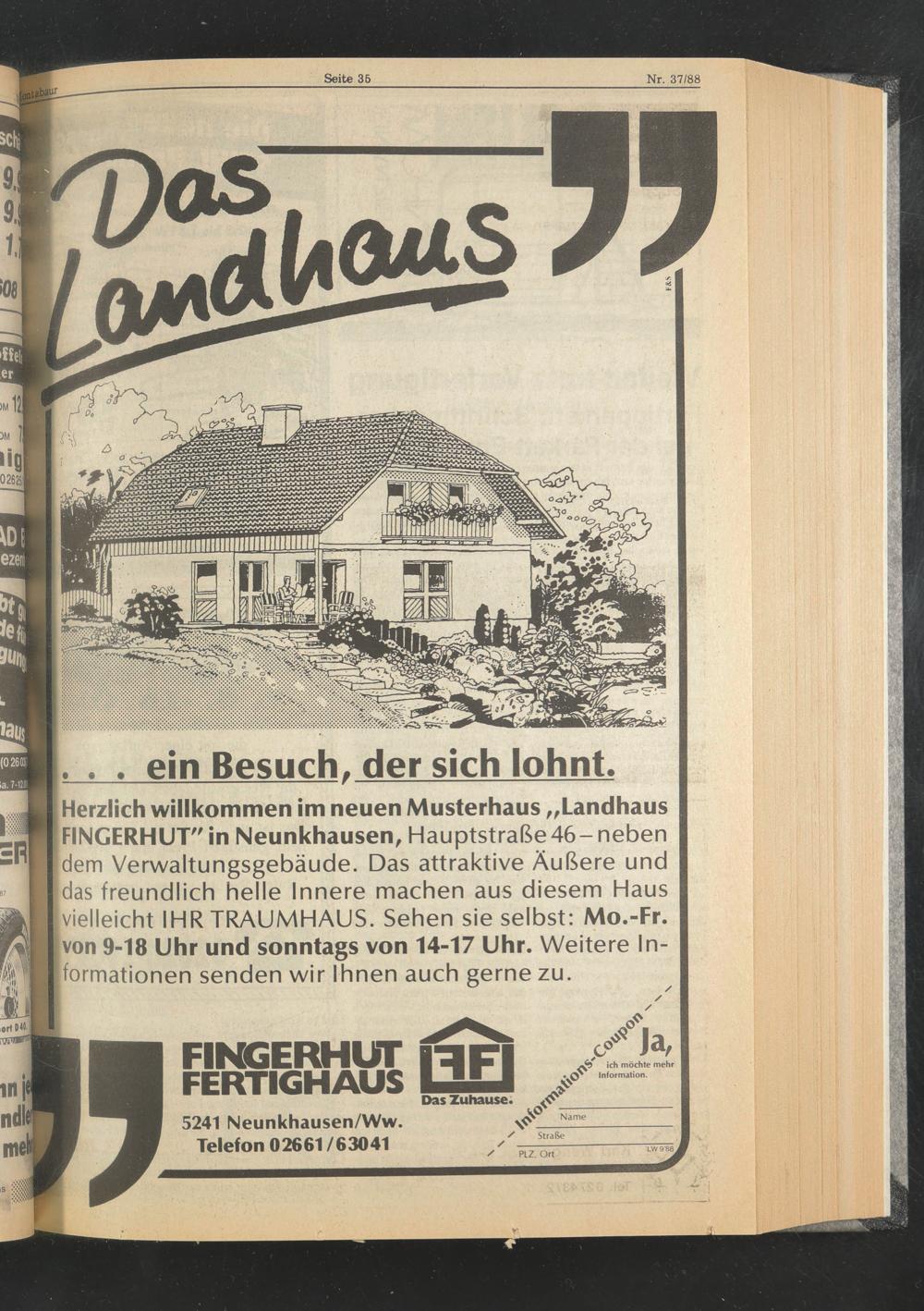 Herzlich willkommen im neuen Musterhaus „Landhaus FINGERHUT" in Neunkhausen, Hauptstraße 46 - neben dem Verwaltungsgebäude. Das attraktive Äußere und das freundlich helle Innere machen aus diesem Haus [vielleicht IHR TRAUMHAUS. Sehen sie selbst: Mo.-Fr. [von 9-18 Uhr und sonntags von 14-17 Uhr. Weitere In- Iformationen senden wir Ihnen auch gerne zu.