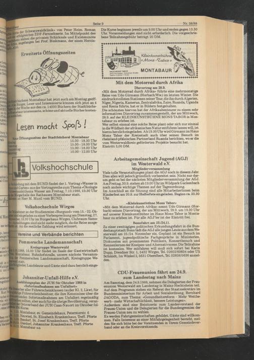 Wer selbst einmal eine solche Reise plant oder sich nur einmal in die Wildheit der afrikanischen N atur entführen lassen will, ist hierzu herzlich eingeladen. Abi 9.30 Uhr wird Girmann im Haus Mons Ihbor der Kreisstadt auch über seinen Besuch im rheinland-pfälzischen Partnerland Ruanda berichten, wo er die vom Westerwaldkreis geförderten Projekte besucht hat. Eintritt 3,00 DM.