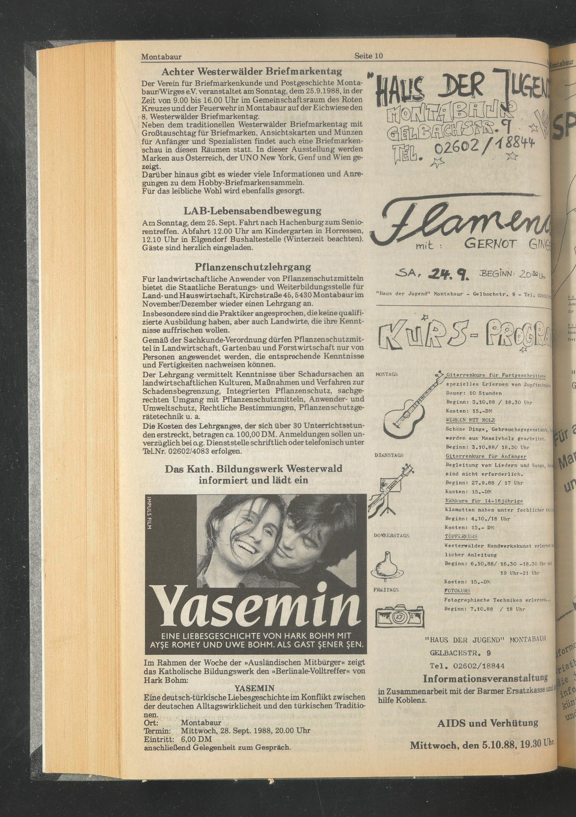 Der Verein für Briefmarkenkunde und Postgeschichte Montabaur/Wirges e.V. veranstaltet am Sonntag, dem 26.9.1988, in der Zeit von 9.00 bis 16.00 Uhr im Gemeinschaftsraum des Roten Kreuzes und der Feuerwehr in Montabaur auf der Eichwiese den 8. Westerwälder Briefmarkentag.