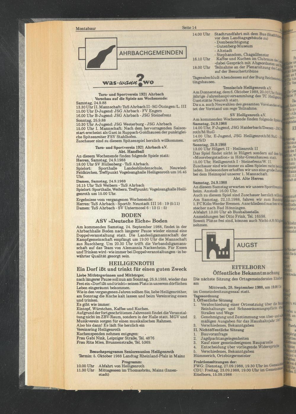 FWG: Dienstag, 27.09.1988,19.30 Uhr im Gememdö CDU: Freitag, 23.09.1988,19.00 Uhr iiü Gemeindet® Eitelborn, 15.09.1988
