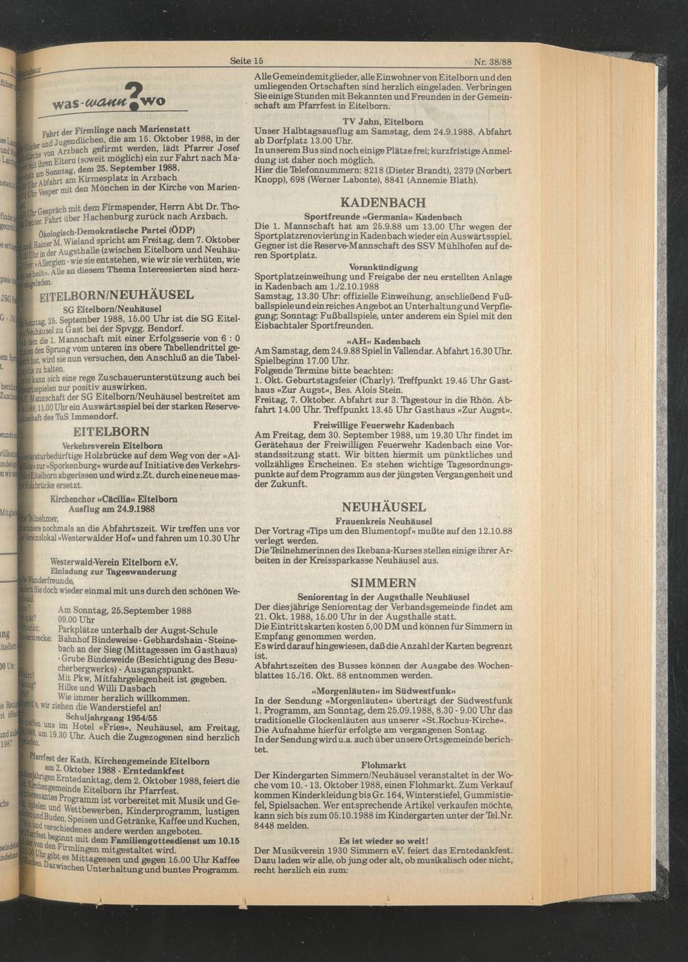 Sportfreunde »Germania« Kadenbach Die 1. Mannschaft hat am 25.9.88 um 13.00 Uhr wegen der Sportplatzrenovierung in Kadenbach wieder ein Auswärtsspiel. Gegner ist die Reserve-Mannschaft des SSV Mühlhofen auf deren Sportplatz.