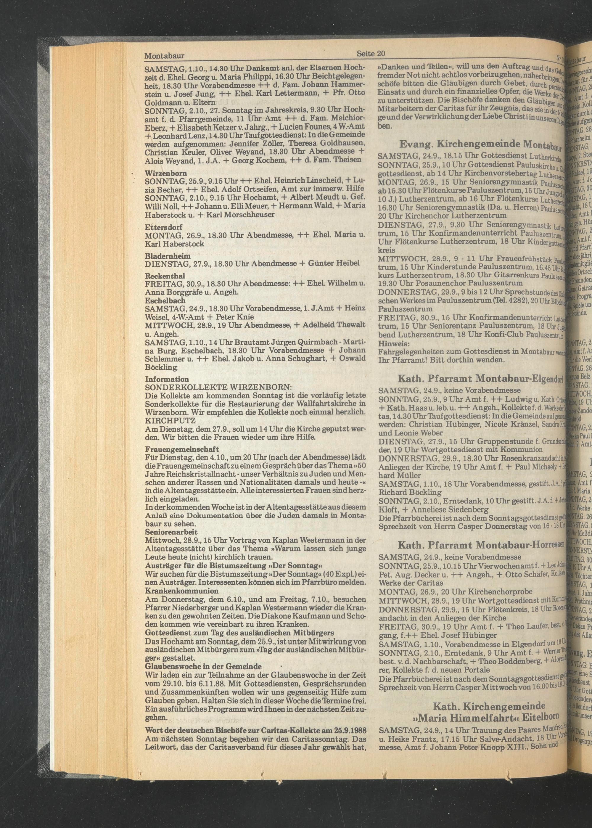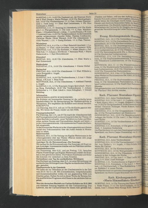 Am Donnerstag, dem 6.10., und am Freitag, 7.10., besuchen Pfarrer Niederberger und Kaplan Westermann wieder die Kranken zu den gewohnten Zeiten. Die Diakone Kaufmann und Schoden kommen wie vereinbart zu ihren Kr ank en Gottesdienst zum Tag des ausländischen Mitbürgers Das Hochamt am Sonntag, dem 25.9., ist unter Mitwirkung von ausländischen Mitbürgern zum »Thgder ausländischen Mitbürger« gestaltet.