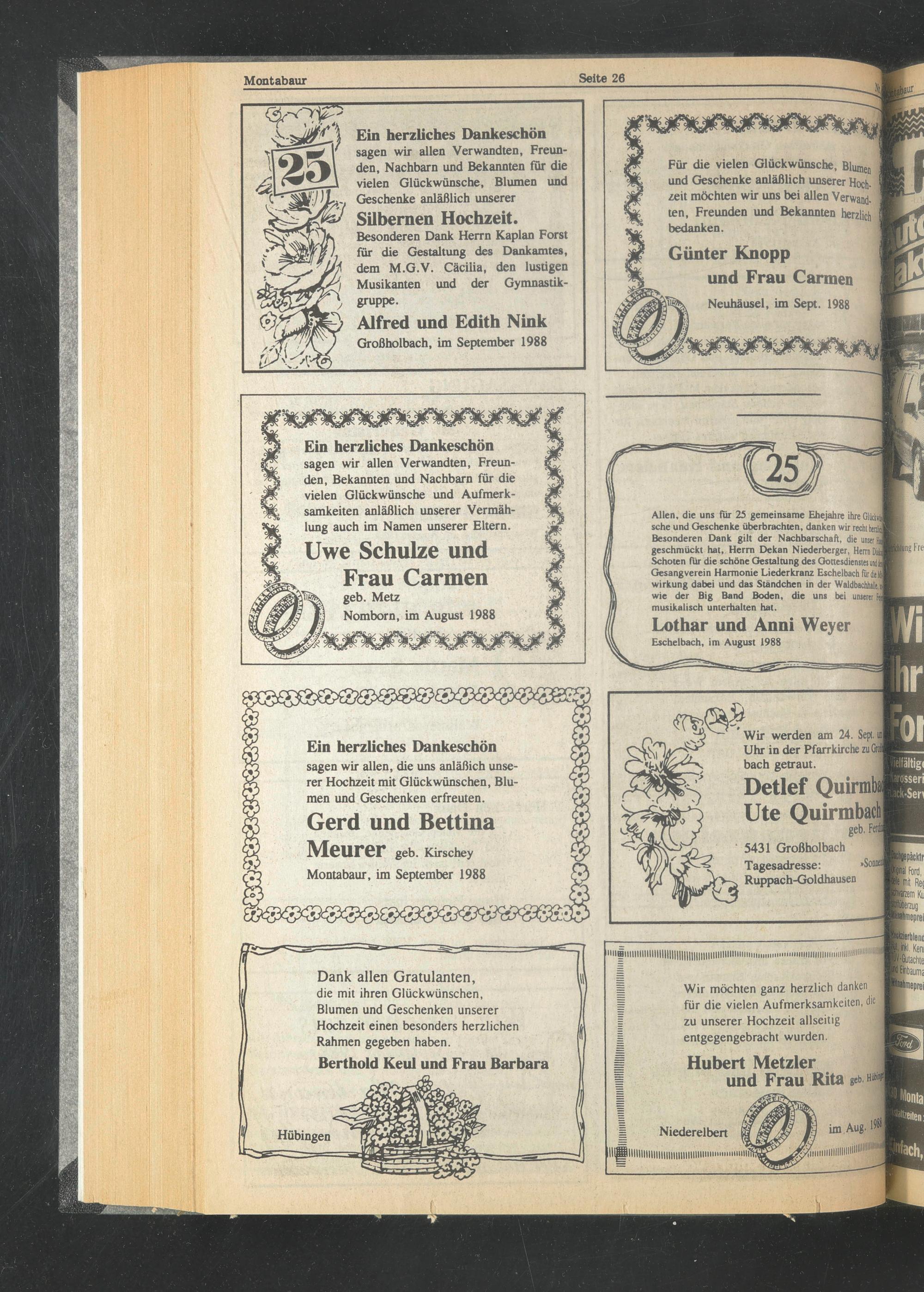 Allen, die uns für 25 gemeinsame Ehejahre ihre Glicht sehe und Geschenke überbrachten, danken wir recht htui Besonderen Dank gilt der Nachbarschaft, die i geschmückt hat, Herrn Dekan Niederberger, Hem D Schoten für die schöne Gestaltung des Gottesdienst« mti Gesangverein Harmonie Liederkranz Eschelbach für dielt Wirkung dabei und das Ständchen in der Waldbachhille,ij wie der Big Band Boden, die uns bei unterer I musikalisch unterhalten hat.