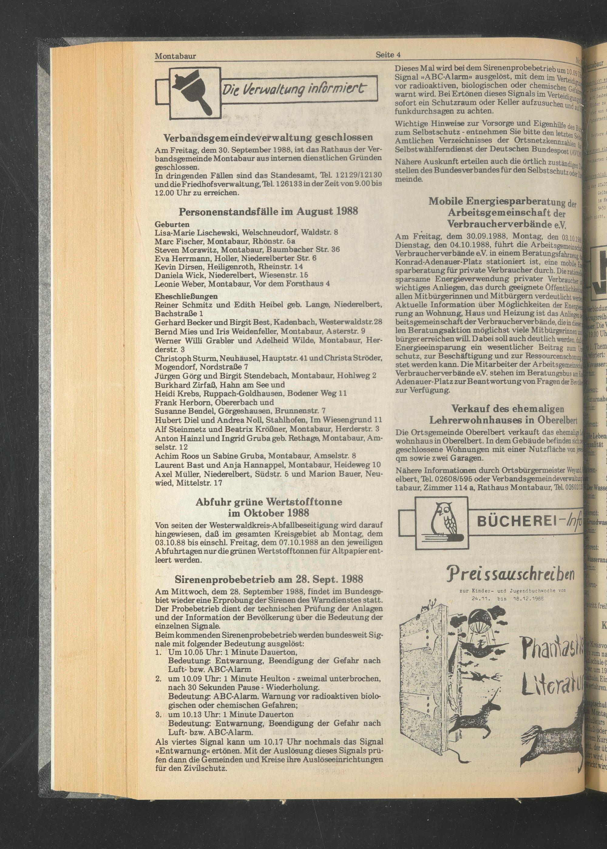Am Freitag, dem 30. September 1988, ist das Rathaus der Verbandsgemeinde Montabaur aus internen dienstlichen Gründen geschlossen.