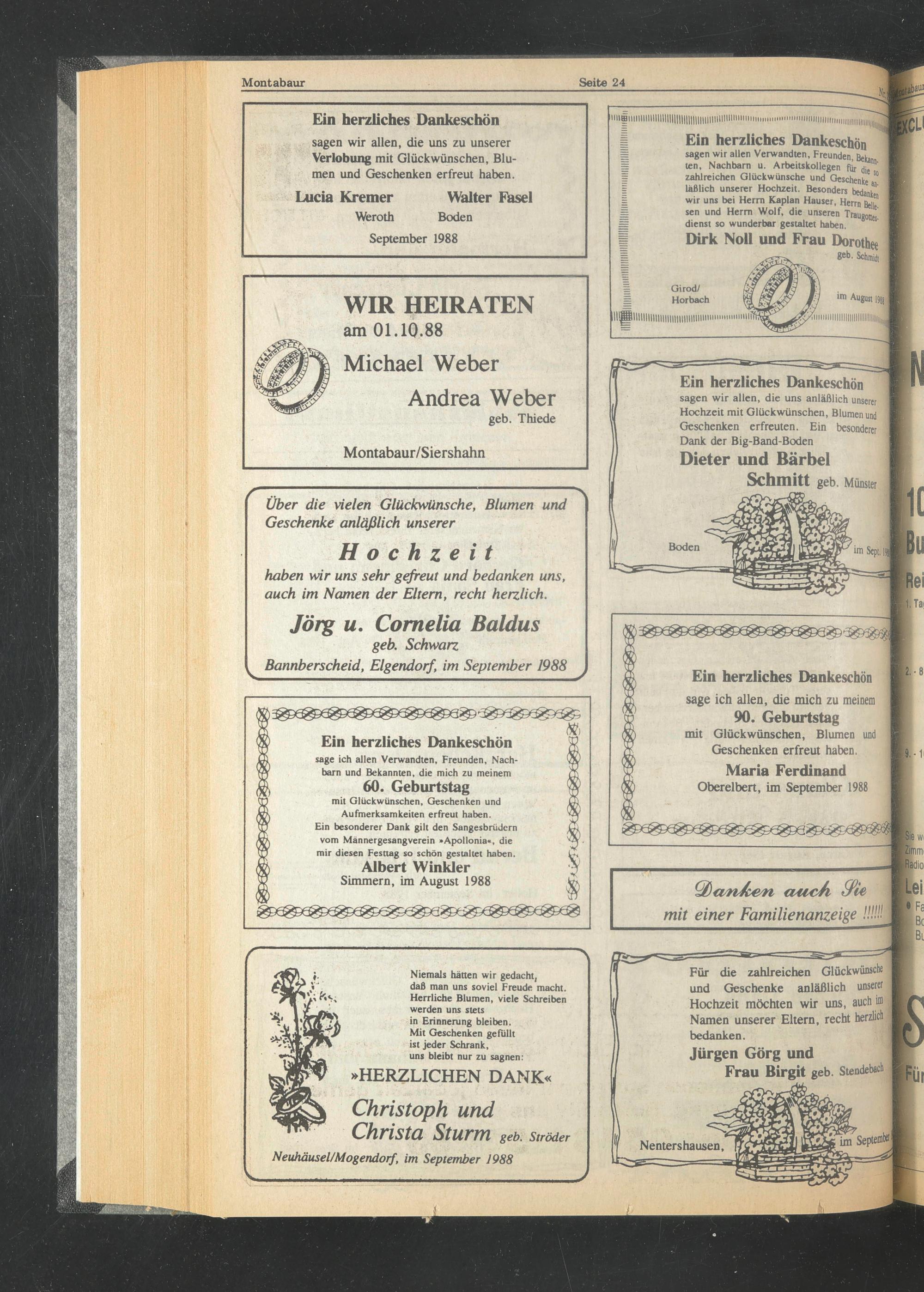 sagen wir allen, die uns anläßlich unserer Hochzeit mit Glückwünschen, Blumen und Geschenken erfreuten. Ein besonderer Dank der Big-Band-Boden
