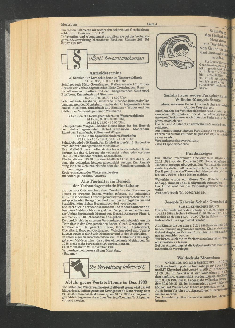 D) Schule für Sprach behinderte Singhofen 12.12. bis 16.12.1988, 08.00 -12.00 Uhr Schulgebäude 6409 Singhofen, Erich-Kästner-Str. 1, für den Bereich der Verbandsgemeinde Montabaur Es sind alle Kinder mit offensichtlicher oder vermuteter Behinderung, die das 6. Lebensjahr vollendet haben oder vor dem 30.06.1989 vollenden werden, anzumelden.