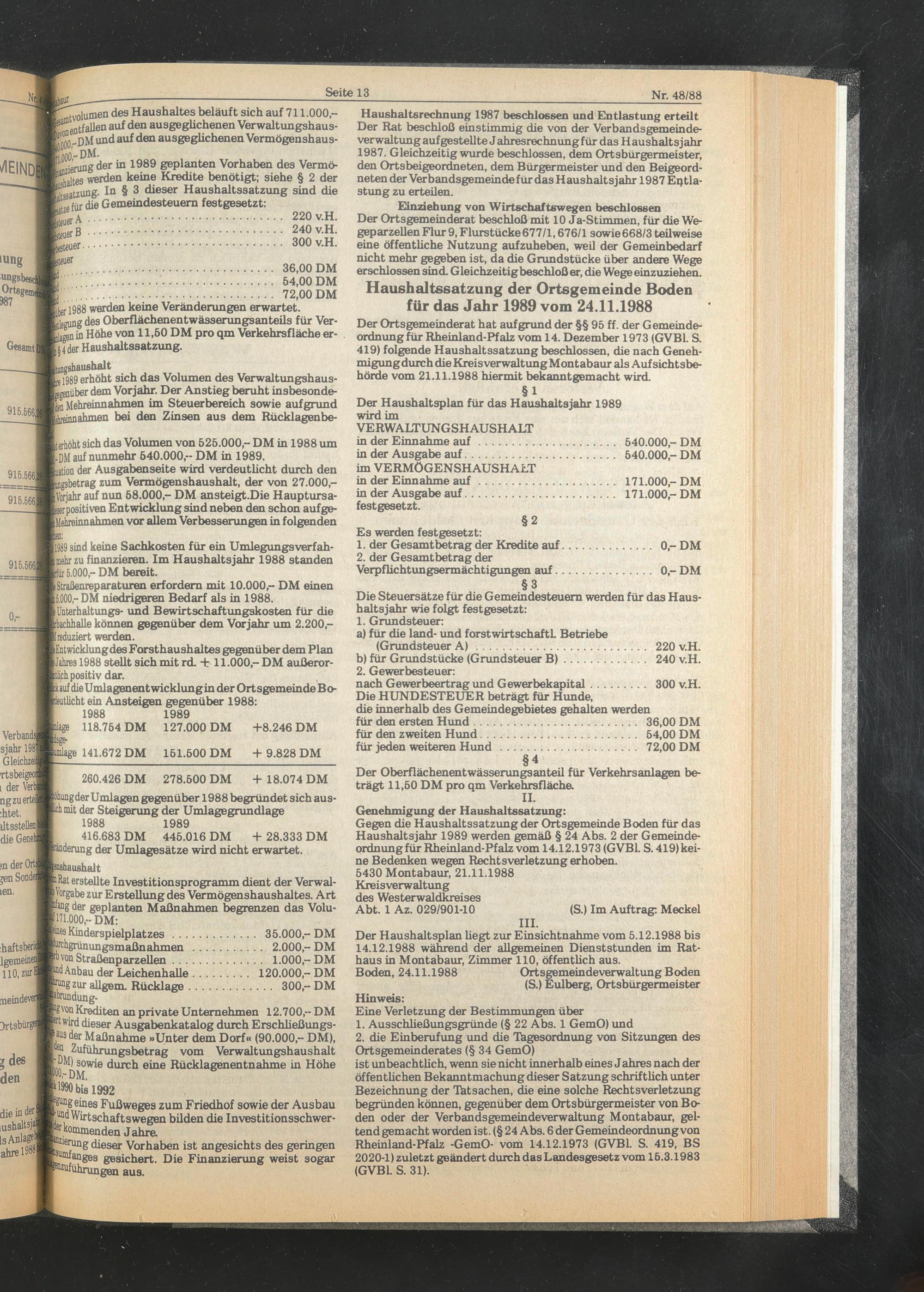 Haushaltssatzung der Ortsgemeinde Boden für das Jahr 1989 vom 24.11.1988