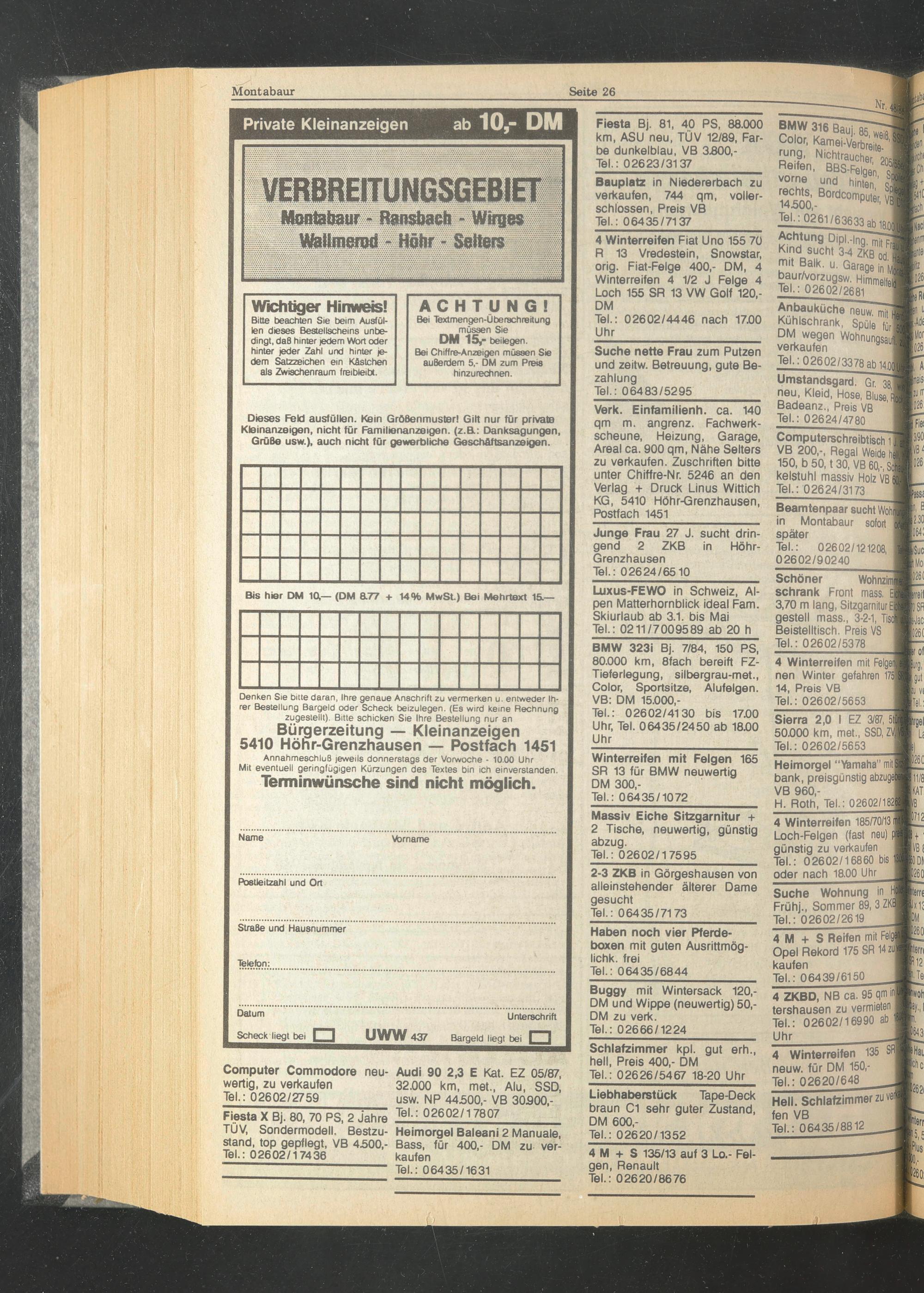 Bei Chiffre-Anzeigen müssen Sie außerdem 5,- DM zum Preis hinzunechnen.