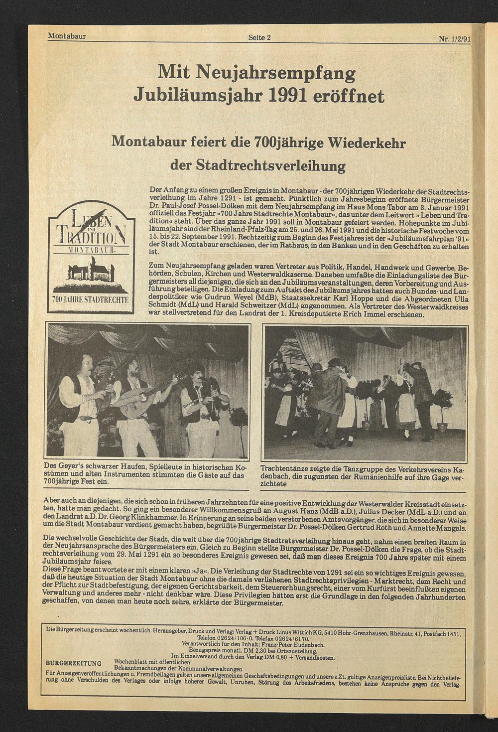 Der Anfangzu einem großen Ereignis in Montabaur ■ der 700jährigen Wiederkehr der Stadtrechtsverleihung im Jahre 1291 - ist gemacht. Pünktlich zum Jahresbeginn eröffnete Bürgermeister Dr. Paul-Josef Possel-Dölken mit dem Neujahrsempfang im Haus Mons Ihbor am 3. Januar 1991 offiziell das Fest jahr »700 Jahre Stadtrechte Montabaur», das unter dem Leitwort» Leben und TVa- dition« steht. Über das ganze J ahr 1991 soll in Montabaur gefeiert werden. Höhepunkte im Jubiläumsjahr sind der Rheinland-Pf alz-Thg am 25. und 26. Mai 1991 und die historische Festwoche vom 16. bis 22. September 1991. Rechtzeitig zum Beginn des Festjahres ist der »Jubiläumsfahrplan ‘91« der Stadt Montabaur erschienen, der im Rathaus, in den B anken und in den Geschäften zu erhalten ist.