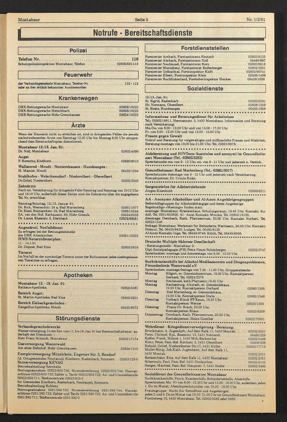 der Verbandagemeinde Montabaur, Tblefon-Nr. . 110-112