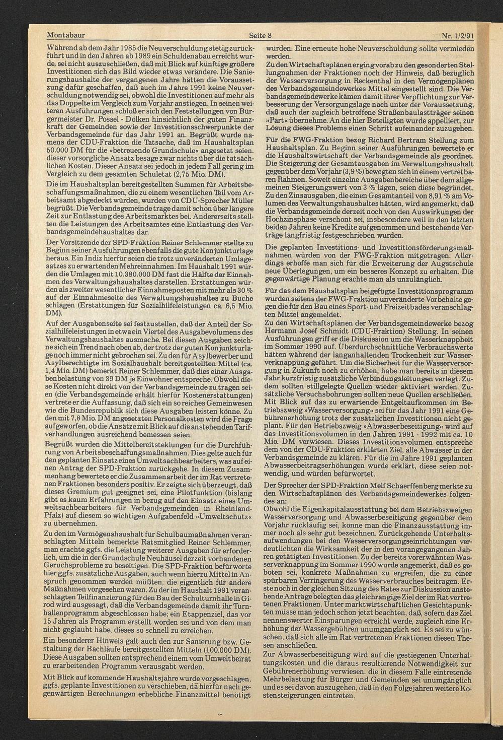 Während ab dem Jahr 1985 die Neuverschuldung stetig zurückführt und in den Jahren ab 1989 ein Schuldenabau erreicht wurde, sei nicht auszuschließen, daß mit Blick auf künftige größere Investitionen sich das Bild wieder etwas verändere. Die Sanierungshaushalte der vergangenen Jahre hätten die Voraussetzung dafür geschaffen, daß auch im Jahre 1991 keine Neuverschuldungnotwendig sei, obwohl die Investitionen auf mehr als dasDoppelte im Vergleich zum Vorjahr anstiegen. In seinen weiteren Ausführungen schloß er sich den Feststellungen von Bürgermeister Dr. Possei - Dölken hinsichtlich der guten Finanzkraft der Gemeinden sowie der Investitionsschwerpunkte der Verbandsgemeinde für das Jahr 1991 an. Begrüßt wurde namens der CDU-Fraktion die Tatsache, daß im Haushaltsplan 60.000 DM für die »betreuende Grundschule« angesetzt seien, dieser vorsorgliche Ansatz besage zwar nichts über die tatsächlichen Kosten. Dieser Ansatz sei jedoch in jedem Fall gering im Vergleich zu dem gesamten Schuletat (2,75 Mia DM).