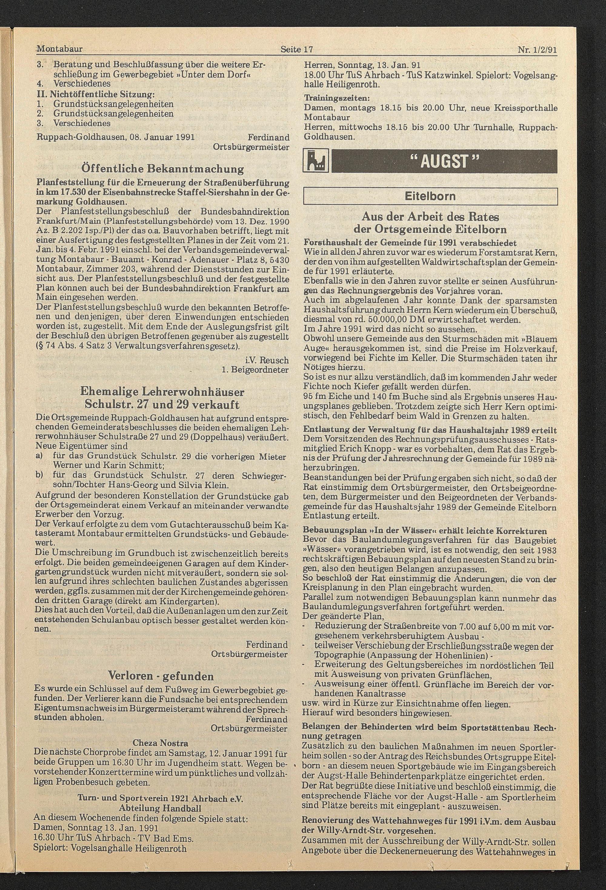 Beanstandungen bei der Prüfung ergaben sich nicht, so daß der Rat einstimmig dem Ortsbürgermeister, den Ortsbeigeordneten, dem Bürgermeister und den Beigeordneten der Verbandsgemeinde für das Haushaltsjahr 1989 der Gemeinde Eitelborn Entlastung erteilt.