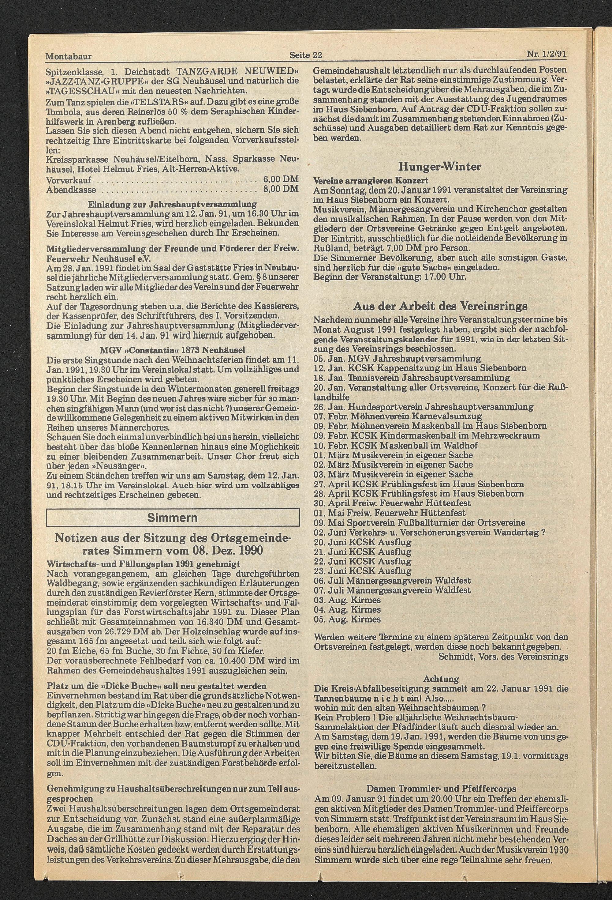 Notizen aus der Sitzung des Ortsgemeinderates Simmern vom 08. Dez. 1990