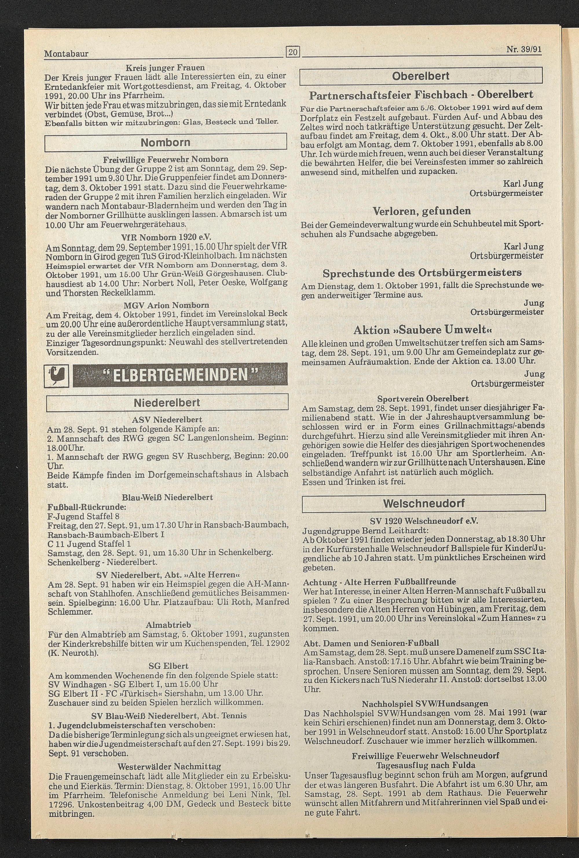 Am Sonntag, dem 29. September 1991,15.00 Uhr spielt der VfR Nombom in Girod gegen TUS Girod-Kleinholbach. Im nächsten Heimspiel erwartet der VfR Nombom am Donnerstag, dem 3. Oktober 1991, um 16.00 Uhr Grün-Weiß Görgeshausen. Clüb- hausdiest ab 14.00 Uhr: Norbert Noll, Peter Oeske, Wolfgang und Thorsten Reckelklamm.