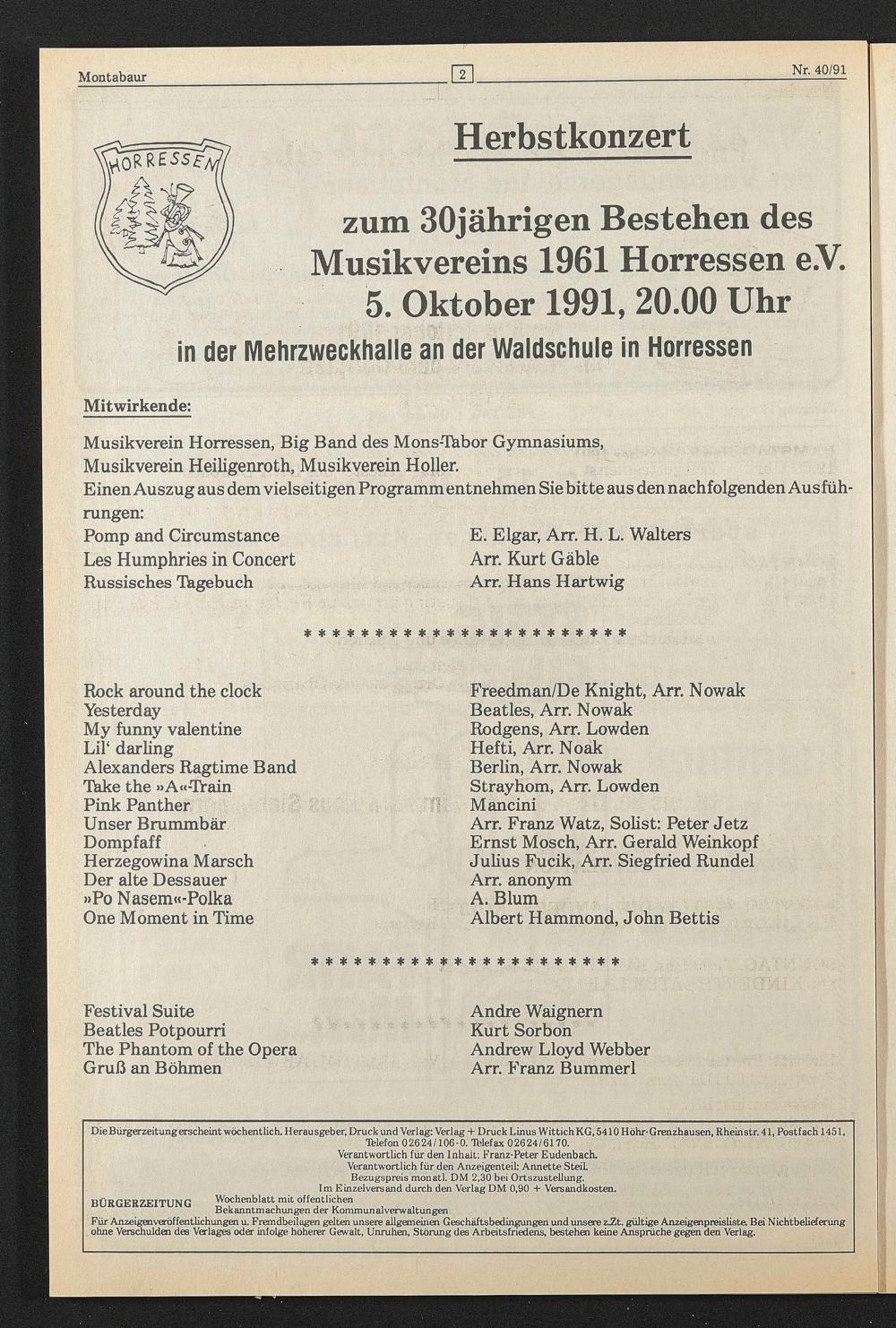 zum 30jährigen Bestehen des Musikvereins 1961 Horressen e.V. 5. Oktober 1991,20.00 Uhr
