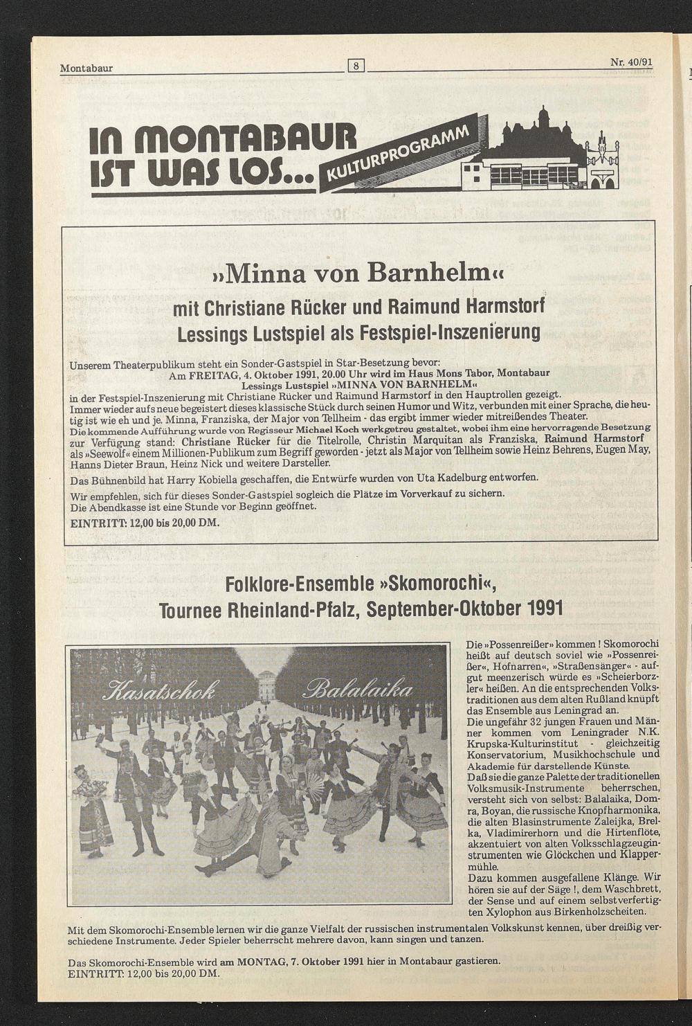 Am FREITAG, 4. Oktober 1991,20.00 Uhr wird im Haus Mons Ihbor, Montabaur Lessings Lustspiel »MINNA VON BARNHELM«