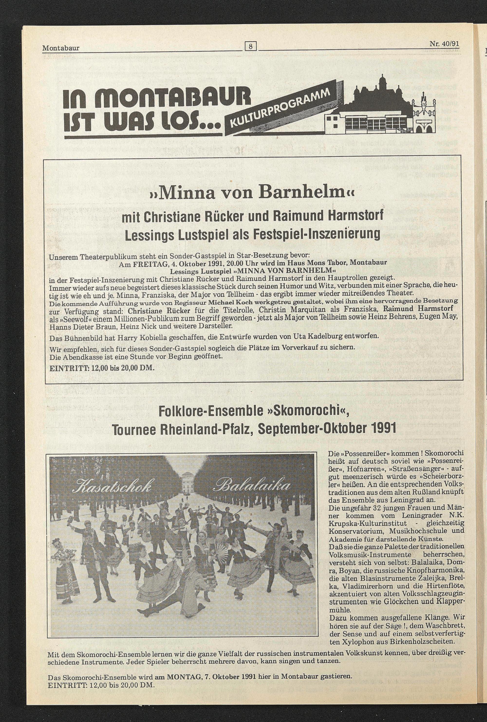 Das Skomorochi-Ensemble wird am MONTAG, 7. Oktober 1991 hier in Montabaur gastieren. EINTRITT. 12,00 bis 20,00 DM.