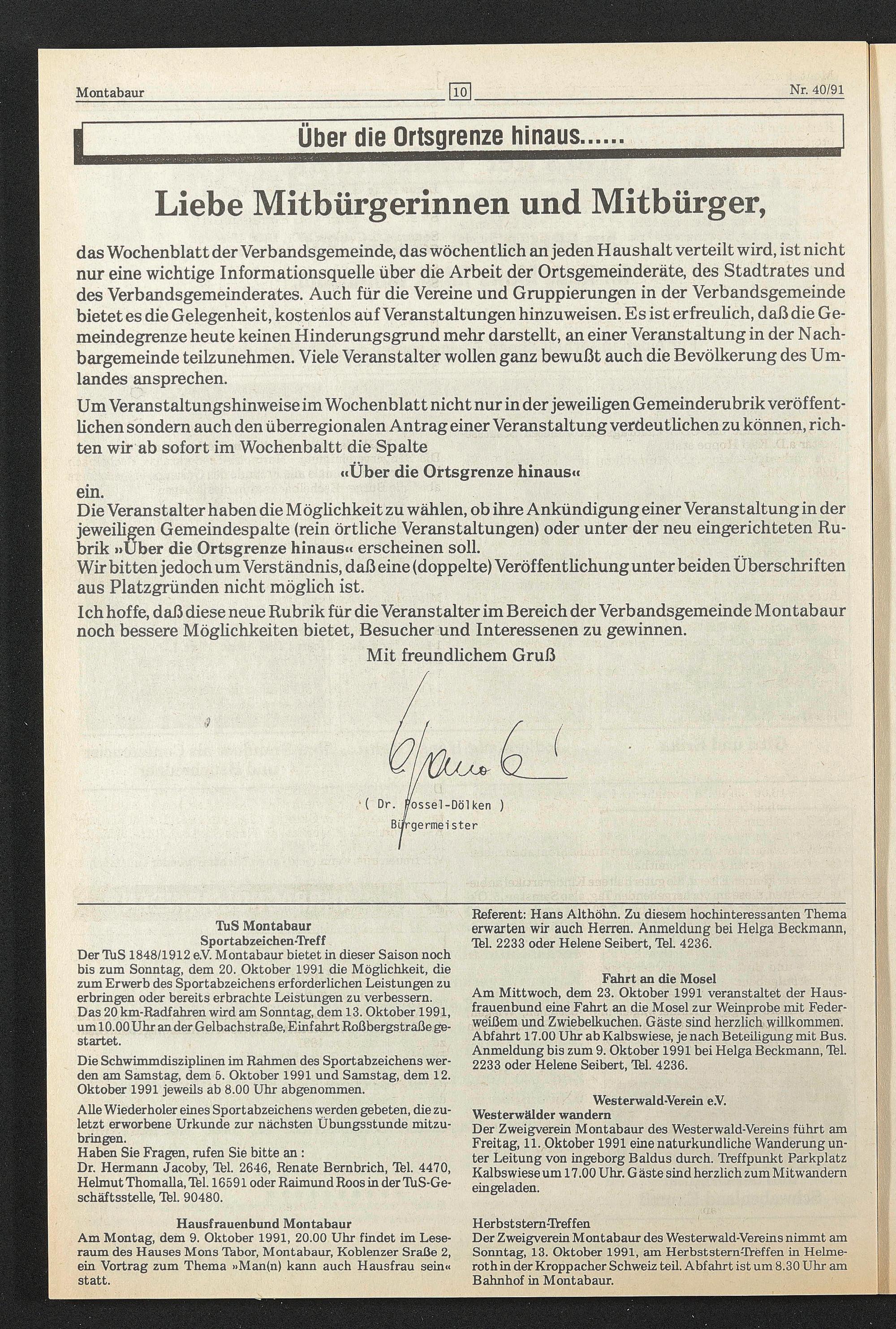 das Wochenblatt der Verbandsgemeinde, das wöchentlich an jeden H aushalt verteilt wird, ist nicht nur eine wichtige Informationsquelle über die Arbeit der Ortsgemeinderäte, des Stadtrates und des Verbandsgemeinderates. Auch für die Vereine und Gruppierungen in der Verbandsgemeinde bietet es die Gelegenheit, kostenlos aüf Veranstaltungen hinzuweisen. Es ist erfreulich, daß die Gemeindegrenze heute keinen Hinderungsgrund mehr darstellt, an einer Veranstaltung in der Nach- bargemeinde teilzunehmen. Viele Veranstalter wollen ganz bewußt auch die Bevölkerung des Umlandes ansprechen.