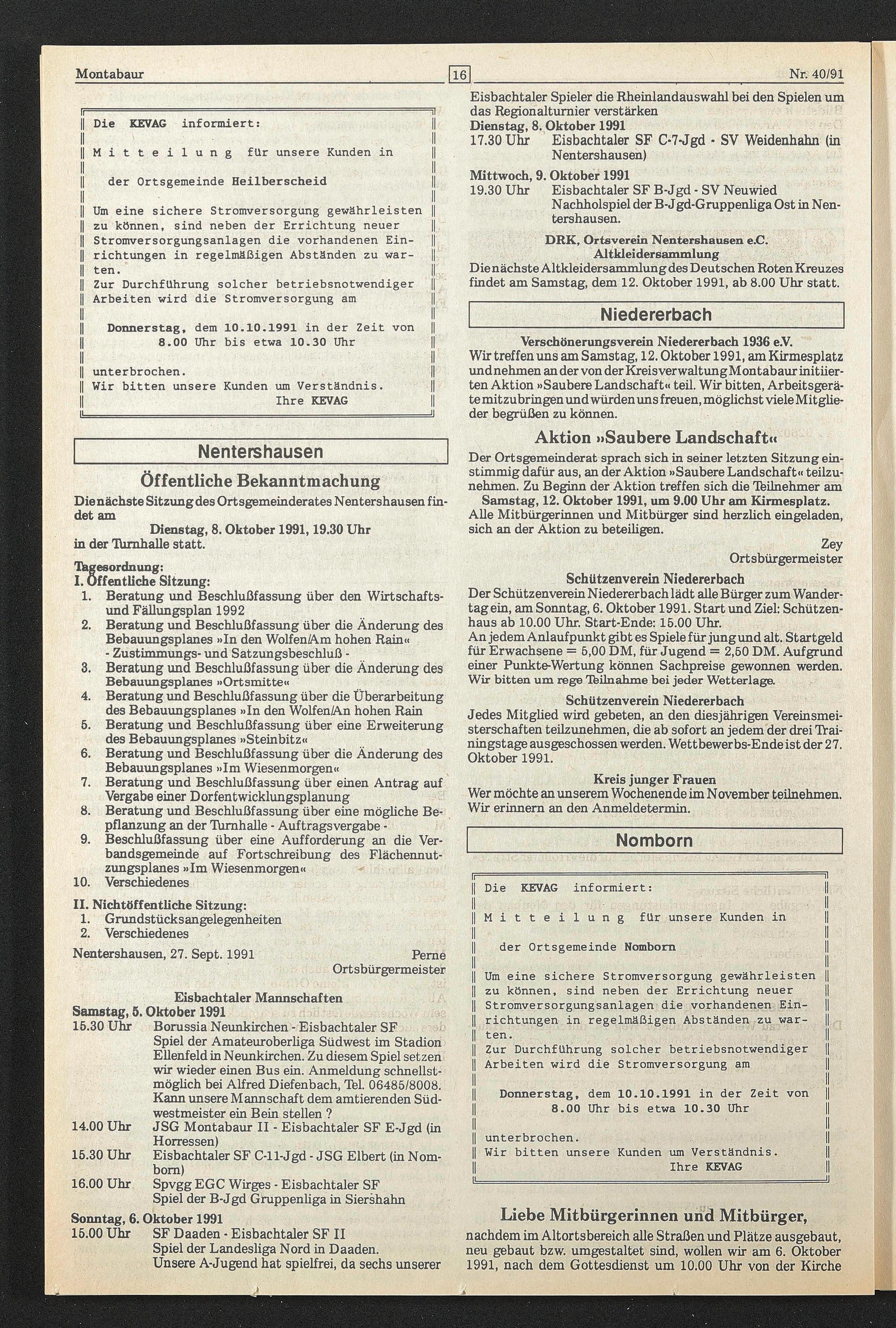 Wir treffen uns am Samstag, 12. Oktober 1991, am Kirmesplatz undnehmen ander von der KreisverwaltungMontabaur initüer- ten Aktion »Saubere Landschaft« teil. Wir bitten, Arbeitsgeräte mitzubringen und würden uns freuen, möglichst viele Mitglieder begrüßen zu können.