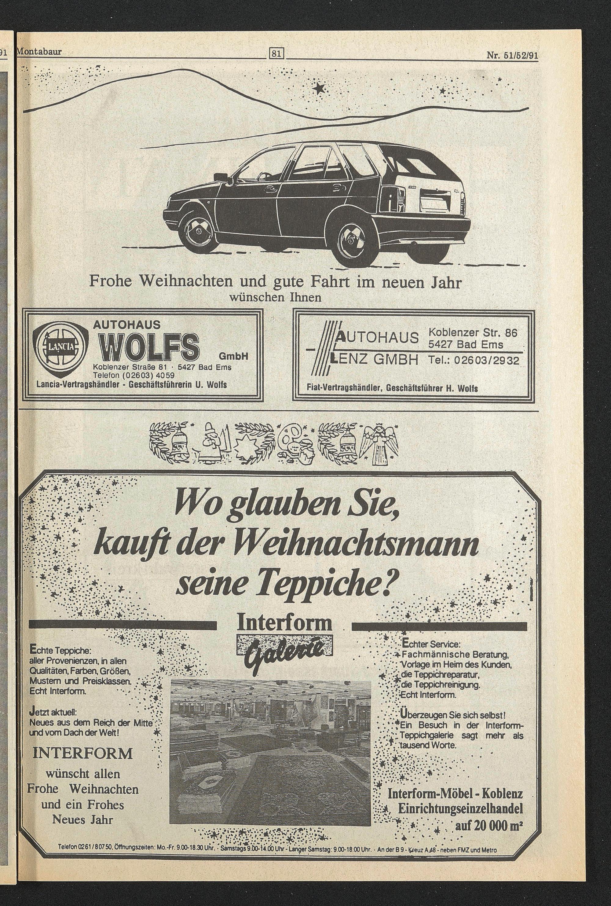 Telefon 0261/80750, Öffnungszeiten: Mo.-Fr. 9.00-18.30 Uhr. 1 Samstags 9.ÖO-U.ÖO Uhr -Tanger Samstag: 9.00-18.00 Uhr.. An der B 9 - *«uz AM-lieben FMZ und Metro