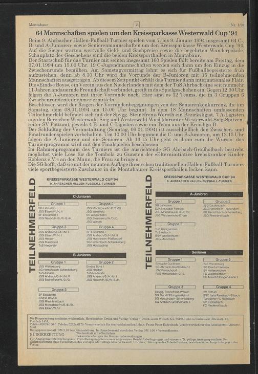 Beim 9. Ahrbacher Hallen-Fußball-Turnier spielen vom 7. bis 9. Januar 1994 insgesamt 64 C-, B- und A-Junioren- sowie Seniorenmannschaften um den Kreissparkasse Westerwald Cup '94. Auf die Sieger warten wertvolle Geld- und Sachpreise sowie die begehrten Wanderpokale. Schauplatz des Geschehens sind die beiden Kreissporthallen in Montabaur.