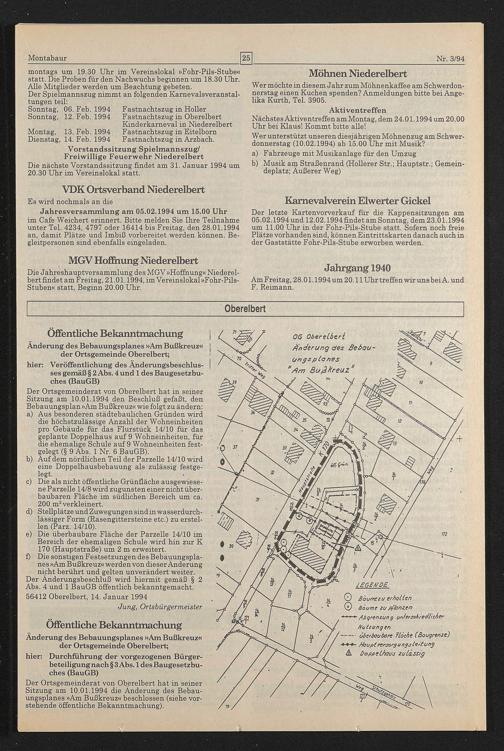 Der Ortsgemeinderat von Oberelbert hat in seiner Sitzung am 10.01.1994 die Änderung des Bebauungsplanes »Am Bußkreuz« beschlossen (siehe vorstehende öffentliche Bekanntmachung).
