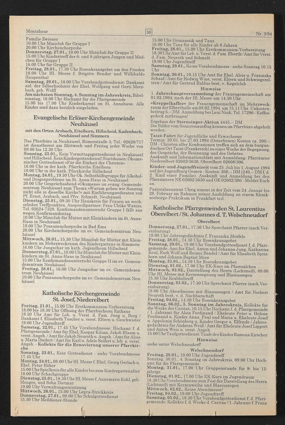 16.00 Uhr in der kath. Pfarrkirche Eitelborn 18.00 Uhr in der kath. Pfarrkirche Hülscheid Montag, 24.01., 19.30 Uhr Ök. Selbsthilfegruppe für Alkohol- und Drogenprobleme im St. Anna-Haus in Neuhäusel 20.00 Uhr Gesprächsabend »Ökumene« im evang. Gemeindezentrum Neuhäusel zum Thema »Warum gehen wir Sonntag nicht alle in dieselbe Kirche?« mit Einführungsreferaten von Pf. Ernst, Arzbach, und Pfvr. Schmidt, Neuhäusel.