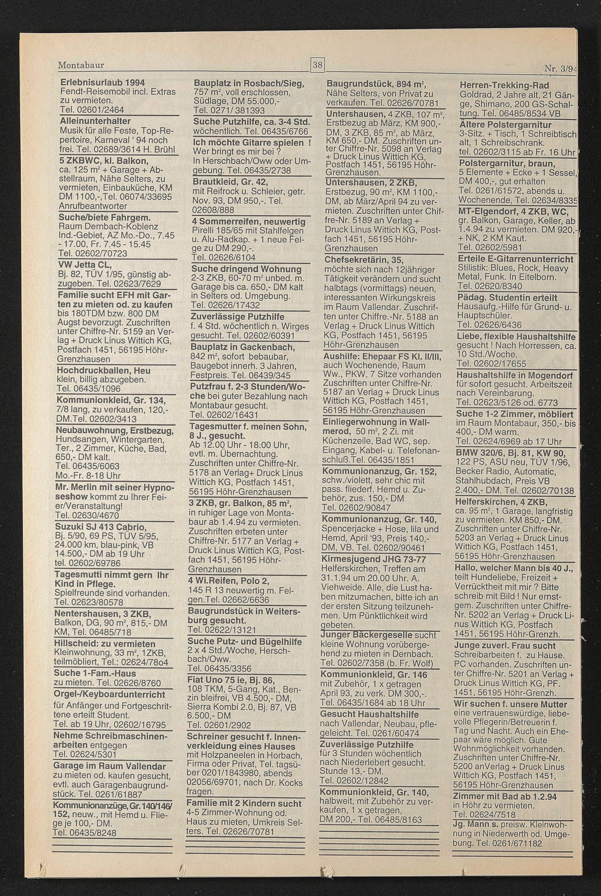 Alleinunterhalter Musik für alle Feste, Top-Re- pertoire, Karneval ‘ 94 noch frei. Tel. 02689/3614 H. Brühl 5 ZKBWC, kl. Balkon, ca. 125 m 2 + Garage + Abstellraum, Nähe Selters, zu vermieten, Einbauküche, KM DM 1100,-,Tel. 06074/33695 Anrufbeantworter_