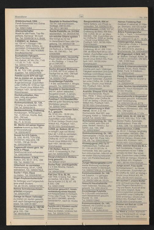 Helferskirchen, 4 ZKB, ca. 95 m 2 ,1 Garage, langfristig : zu vermieten. KM 850,- DM. Zuschriften unter Chiffre-Nr. 5203 an Verlag + Druck Linus Wittich KG, Postfach 1451, 56195 Höhr-Grenzhausen Hallo, welcher Mann bis 40 J., teilt Hundeliebe, Freizeit + Verrücktheit mit mir ? Bitte schreib mit Bild! Nur ernst- gem. Zuschriften unter Chiffre- Nr. 5202 an Verlag + Druck Linus Wittich KG, Postfach 1451, 56195 Höhr-Grenzh.