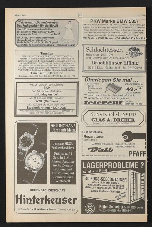 Anm.: Reisedienst Hinterwäller, Dachsenhausen, Tel. 06776/205 od. Nassau - Tel. 02604/4954, tägl. bis 22.00 Uhr