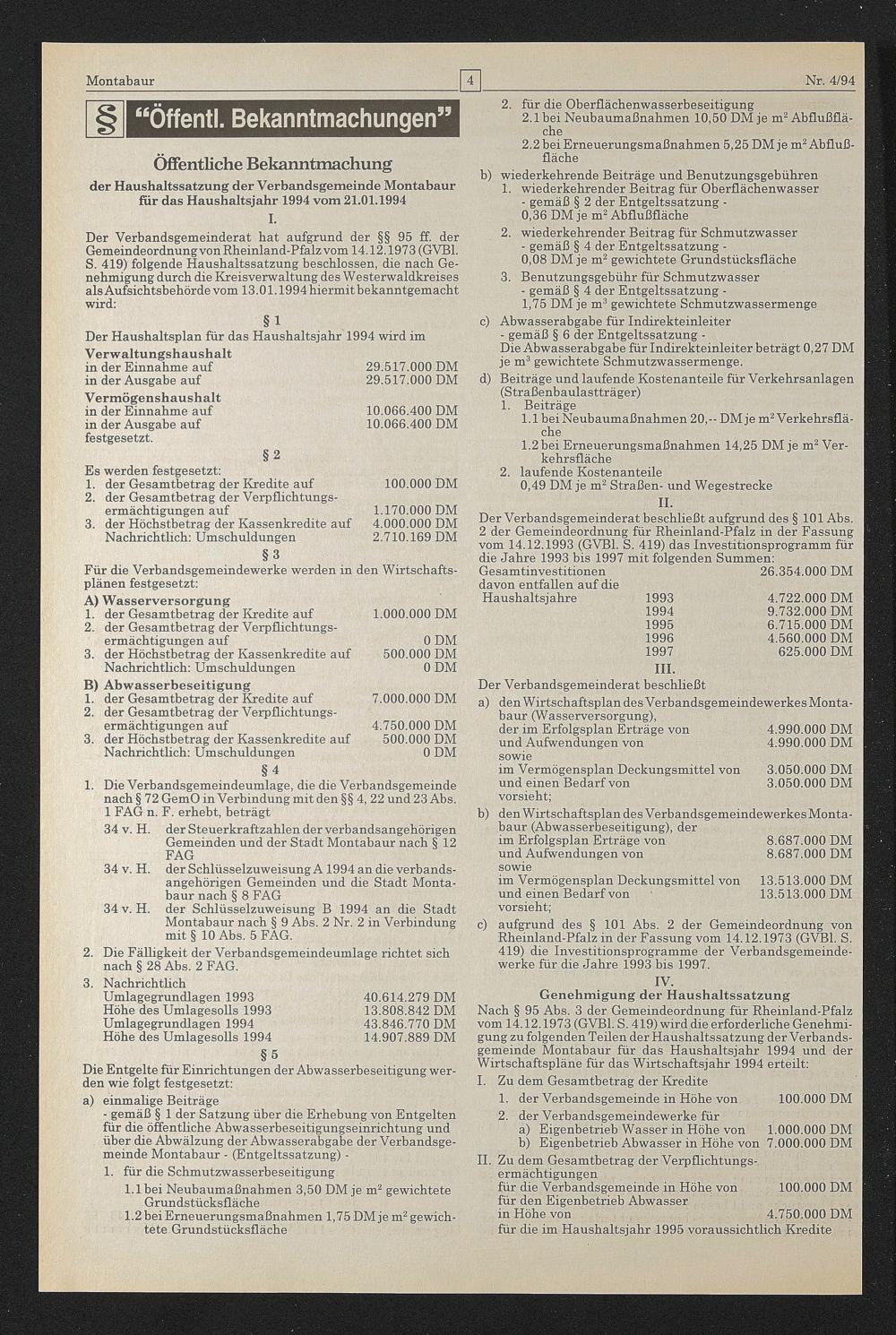 der Haushaltssatzung der Verbandsgemeinde Montabaur für das Haushaltsjahr 1994 vom 21.01.1994 I.