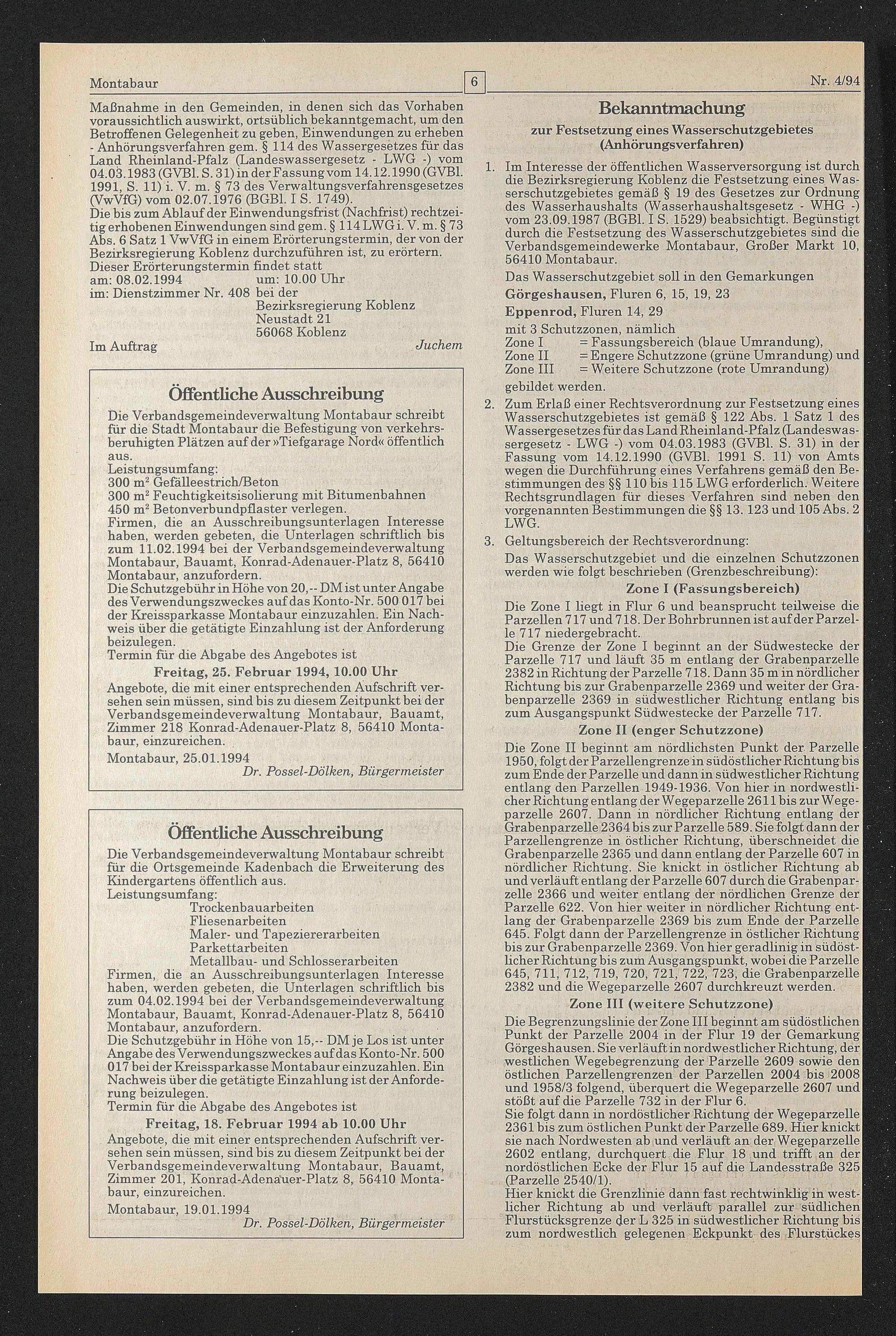 Freitag, 25. Februar 1994,10.00 Uhr Angebote, die mit einer entsprechenden Aufschrift versehen sein müssen, sind bis zu diesem Zeitpunkt bei der Verbandsgemeindeverwaltung Montabaur, Bauamt, Zimmer 218 Konrad-Adenauer-Platz 8, 56410 Montabaur, einzureichen.