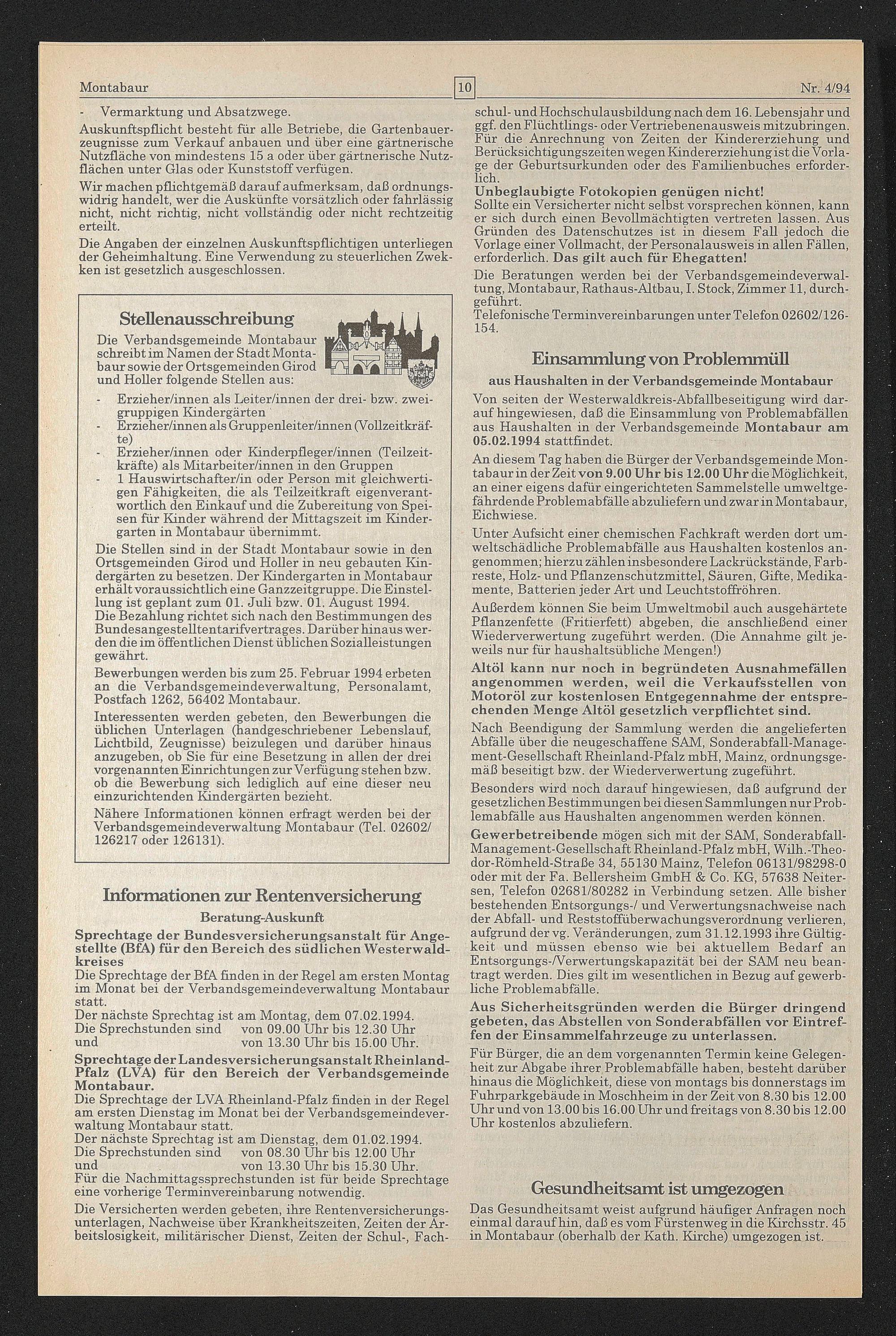 Bewerbungen werden bis zum 25. Februar 1994 erbeten an die Verbandsgemeindeverwaltung, Personalamt, Postfach 1262, 56402 Montabaur.